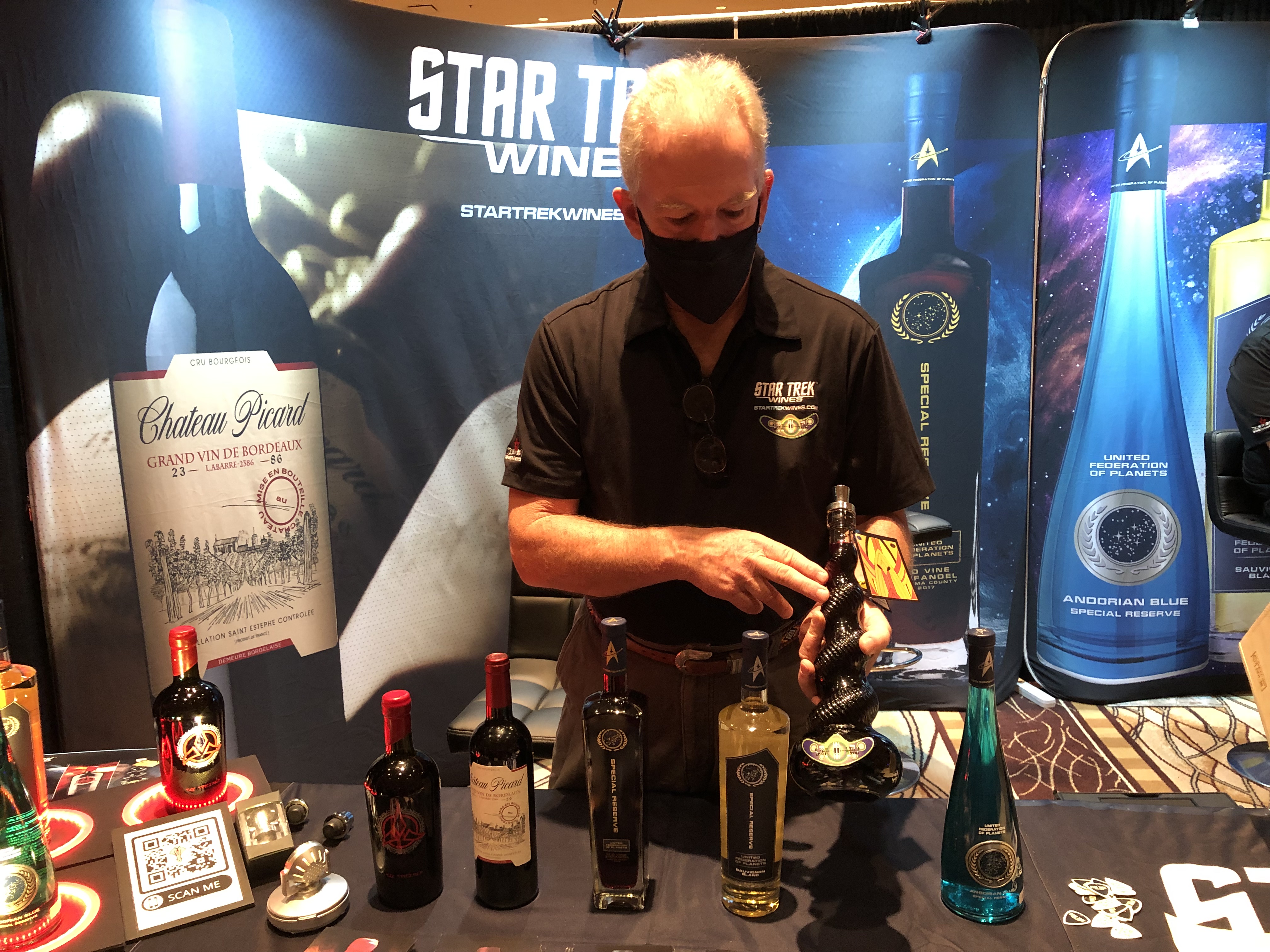 This vendor’s wares would go very well with the Ten Forward set seen above: a representative from Star Trek Wines gives all the backstories of his elegantly bottled Star Trek wines, including Chateau Picard (from an actual coincidentally named Chateau Picard in France!) as well as Cardassian Canar, Andorian Blue, and other exotic alien intoxicants, from startrekwines.com